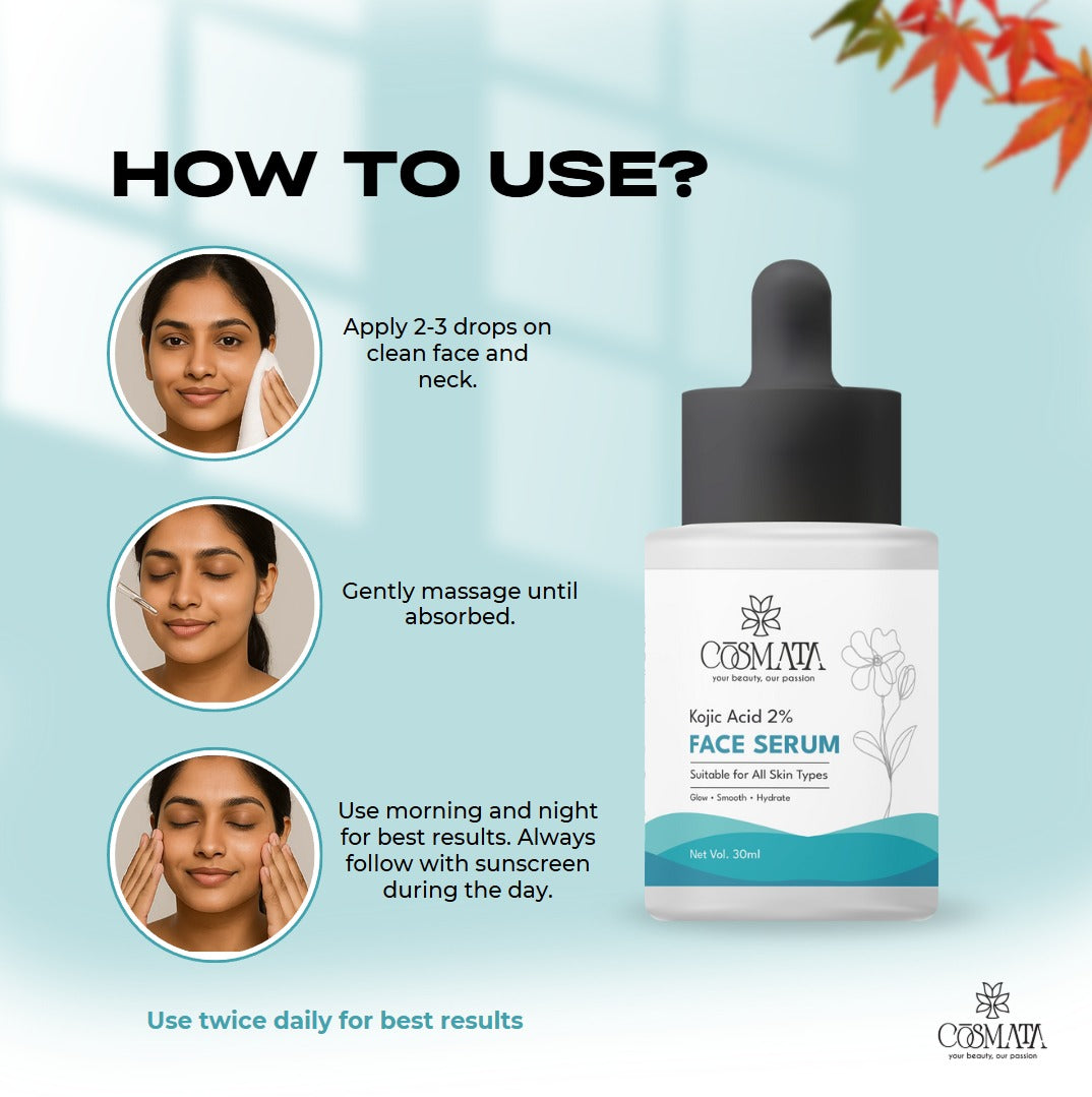Apply 2–3 drops of Kojic Acid Serum evenly on face & neck.