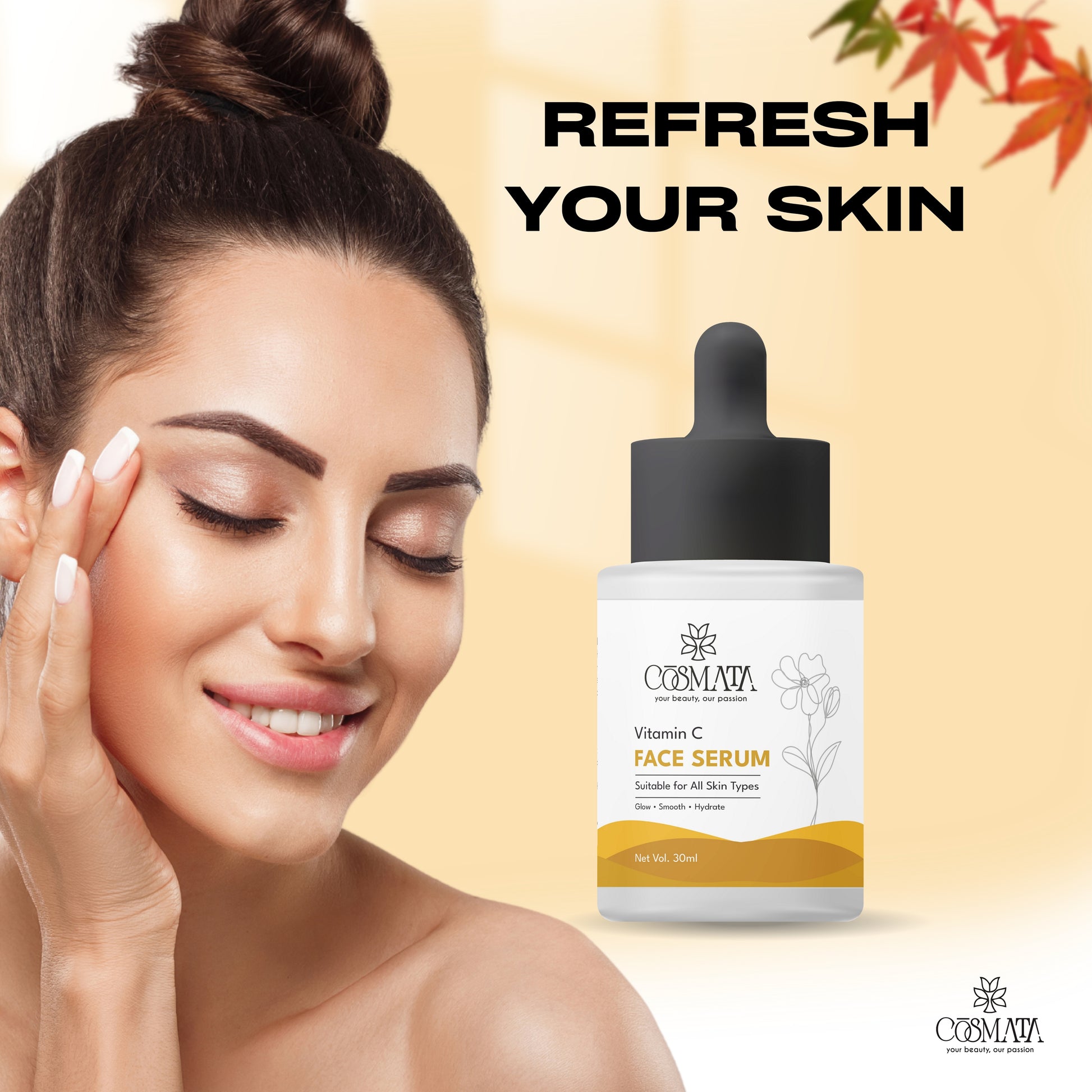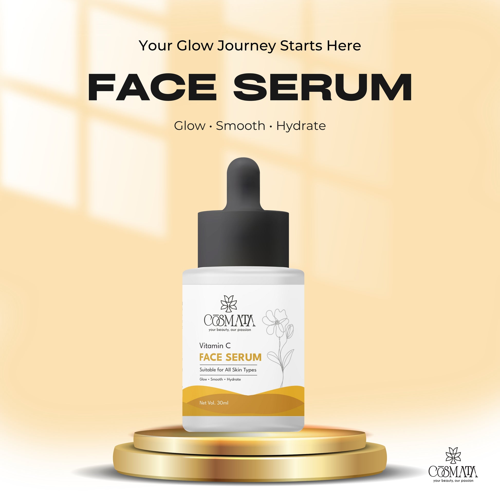 Apply 2–3 drops of Cosmata Vitamin C Serum evenly on face & neck.